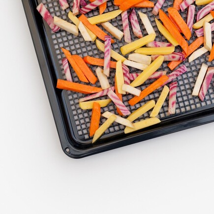 Heizen Sie den Ofen als erstes schon mal vor: Pizzastufe, 215 °C. Dann die rohen Kartoffeln o.ä. in Pommes-Frites-Form schneiden, mit Salz, Pfeffer, einer Prise braunem Zucker und ganz wenig Öl mischen und auf dem AirFry-Blech verteilen. Alle Gemüsestäbchen sollten nebeneinander, nicht übereinander liegen. Und nun ab in den Ofen, und zwar auf die erste Einschubhöhe von unten und dann Ofentür zu.